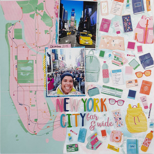Voici une page facile à faire quand on est patient. J'ai découpé à la main plein d'éléments dans les papiers de la collection Go the Scenic Route de Paige Evans. Et j'ai ensuite tout organisé sur la page pour aller avec le plan de New York. Ce papier de plan était parfait pour illustrer mon weekend express à NYC.
